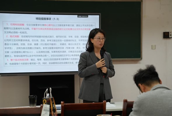 庄莹围绕研究生培养质量作专题讲解,结合《青岛科技大学研究生学位论文评阅工作细则》《研究生学位论文抽检评议结果处理办法》等文件,系统解读了学位论文评阅、抽检评议及学位授予等关键环节的实施细则,为研究生导师落实立德树人职责,开展学术指导,提供了明确规范和工作指引。