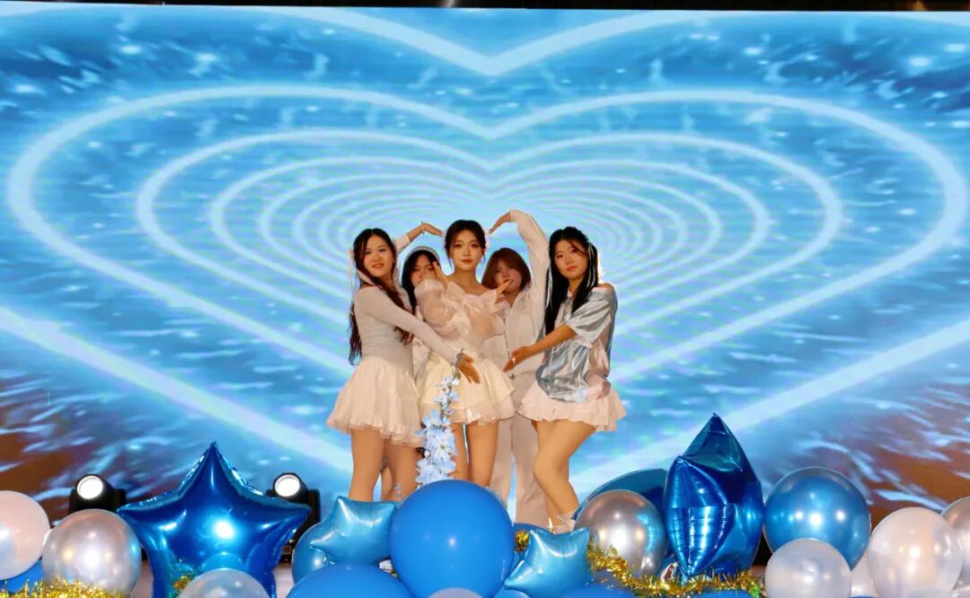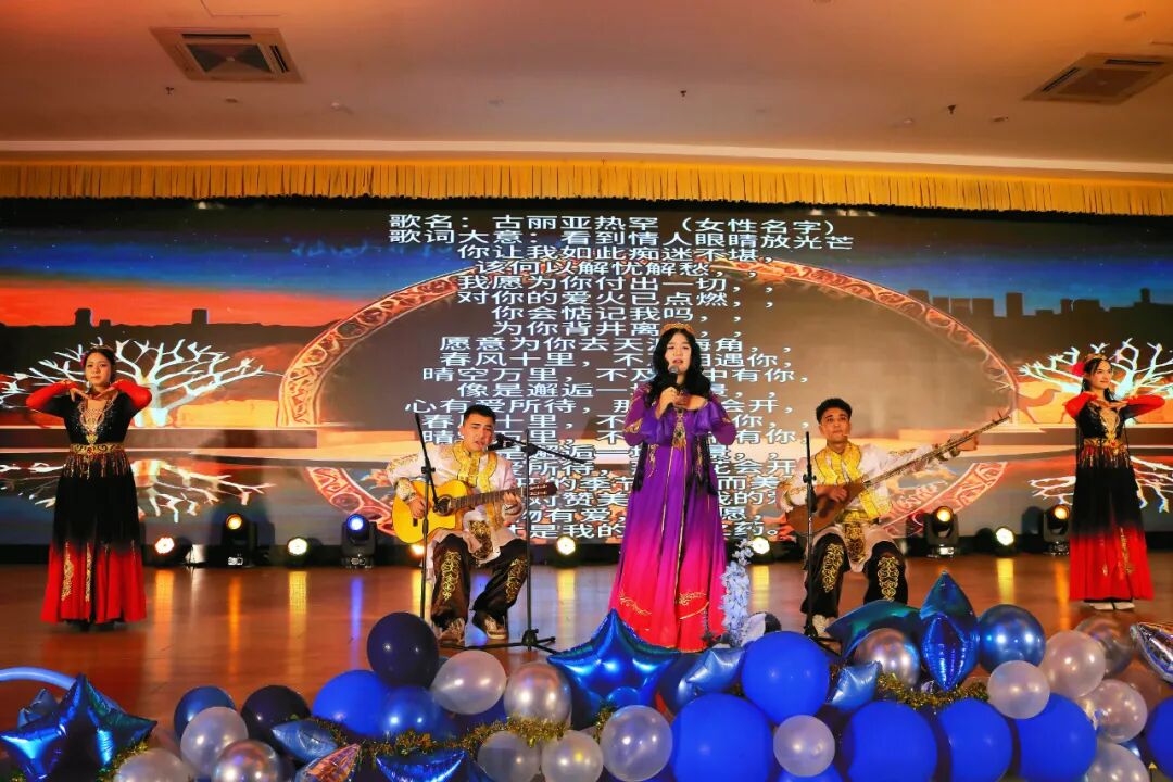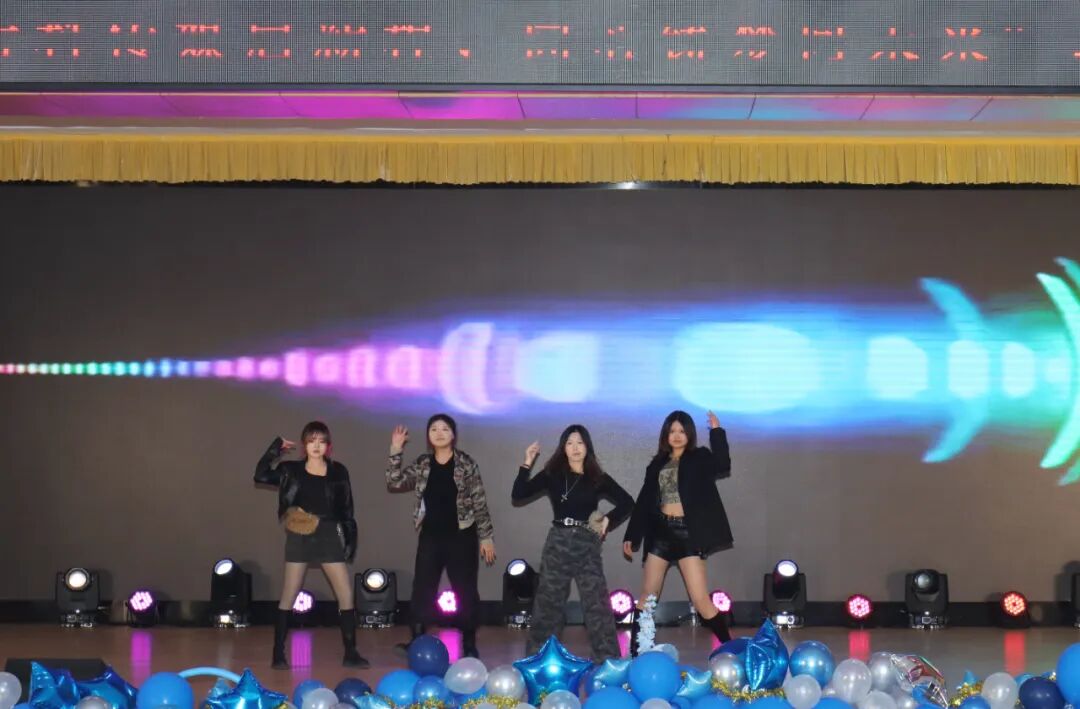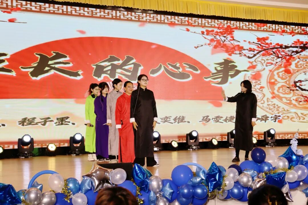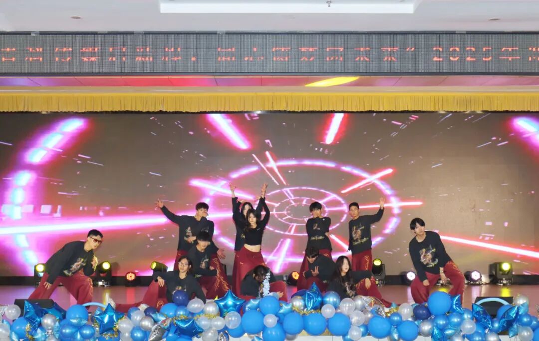 都塔尔弹唱《新疆民歌》奏响浓郁的民族风情,独特的乐器与动人腔调,让观众领略到多元文化的魅力;综合相声《班长的心事》通过活灵活现的表演,将校园趣事演绎得绘声绘色;舞蹈串烧《青春舞步》旋律轻快,把青春里的小确幸娓娓道来;师生歌舞《红日》更是将全场氛围推向顶点——团委老师与学生会骨干同台演绎,以师生同心的画面生动诠释了学院的凝聚力。