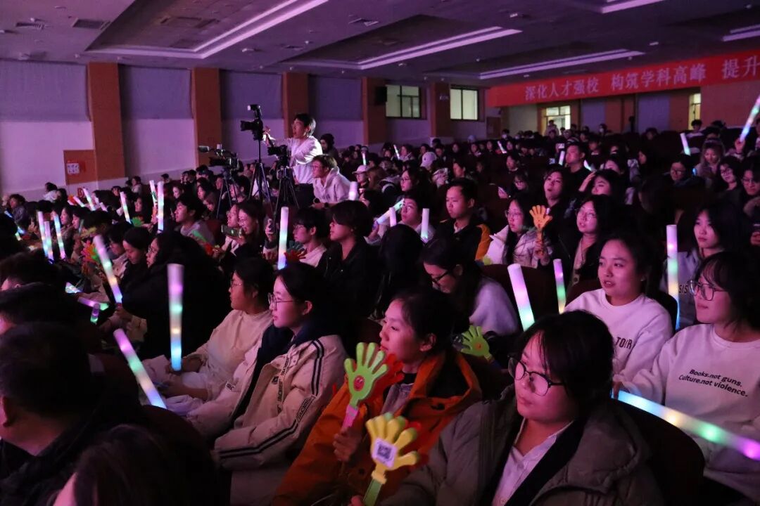 2009届编辑出版学专业校友青岛君巍创业投资公司总经理王振乐、合伙人潘子犇,学院相关部门负责人、系主任、班主任代表、辅导员和在校生共计400余人共赴这场青春盛宴,在光影与歌声中见证传媒学子的成长与绽放。