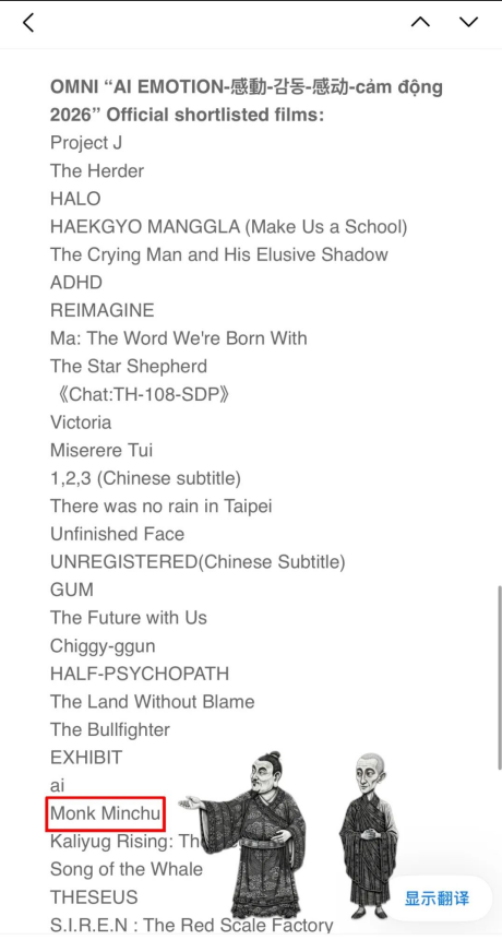 2026年3月,OMNI国际AI电影节携手上海AI短片电影节联合举办OMNI上海特别竞赛单元,打造亚太区顶级AI影像专项竞赛。本次征片范围覆盖中国、日本、韩国、东南亚、印度等多个国家和地区,总投稿量超500部 ,竞争极为激烈,经国际评审团多轮筛选,最终仅29部作品进入终审 ,《僧珉楚》成功突围入围。