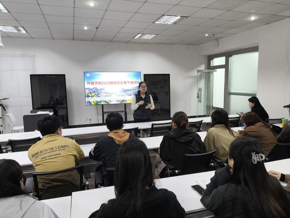 2025级研究生骨干培训会在“一站式”学生社区举行。学院党委副书记兼副院长刘海波、团委副书记兼学工办副主任金莹莹、24级出版专业团支书刘晓阳以及2025级全体研究生班委参加会议。